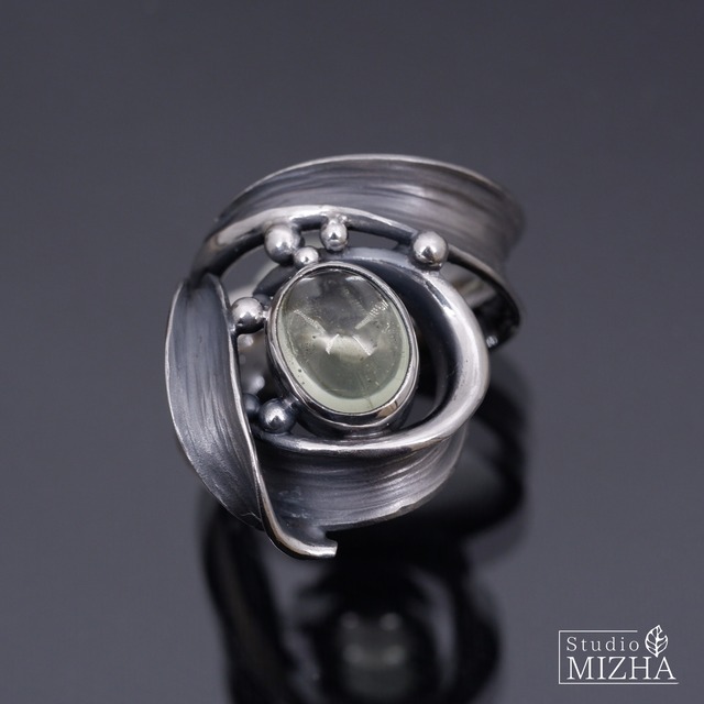 一点もの 素材:銀(925) 石:モスアクアマリン サイズ:14号(サイズ変更不可となっております。お迎えの際は、サイズをよくご確認くださいませ。) 仕上げ:硫化仕上げ(硫化という化学反応による色変化によって立体感を際立たせる仕上げ法で、アンティークな表情になります。) 作家コメント:少し大きめのモスアクアマリンは、森に草葉に佇む水の雫のようです。 その透き通った存在感に響き合うよう、瑞々しさと生命力を宿す葉の造形を添えました。
